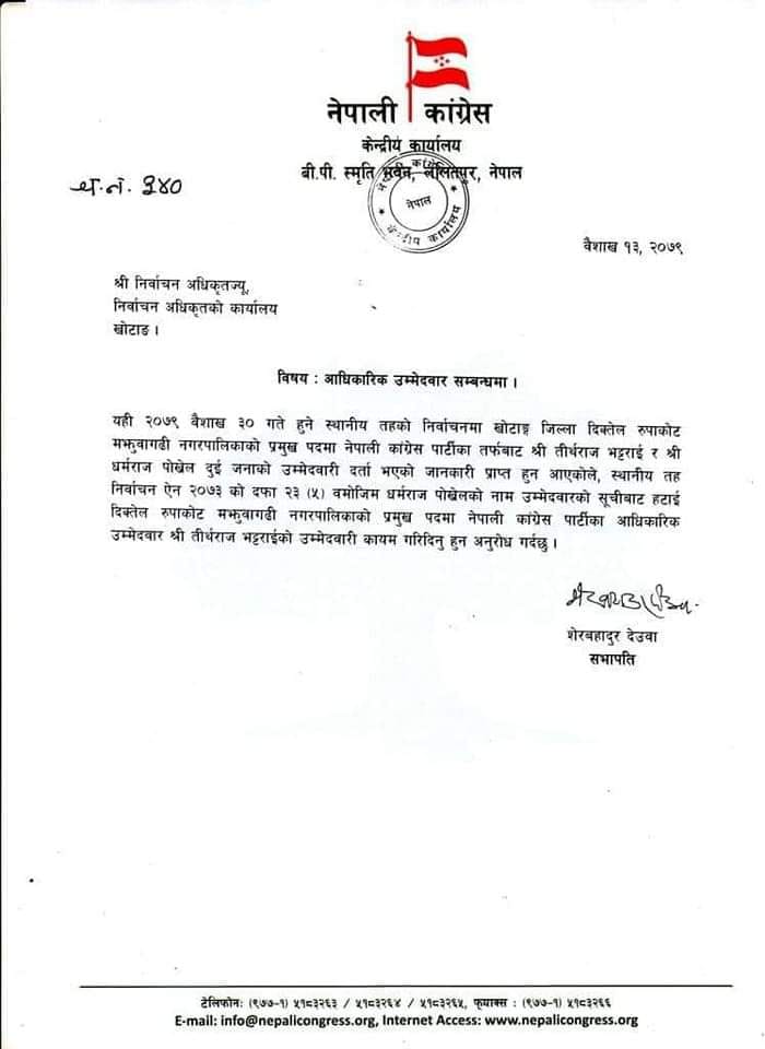 काठमाण्डौ, वैशाखः खोटाङको दिक्तेल रुपाकोट मझुवागडी नगरपालिकाको मेयरको टिकटका लागी नेपाली कांग्रेसको तर्फबाट तीर्थराज भट्टराईलाई पार्टी सभापति शेरबहादुर देउवाले उम्मेदार आधिकारीक पत्र पठाएका छन्।