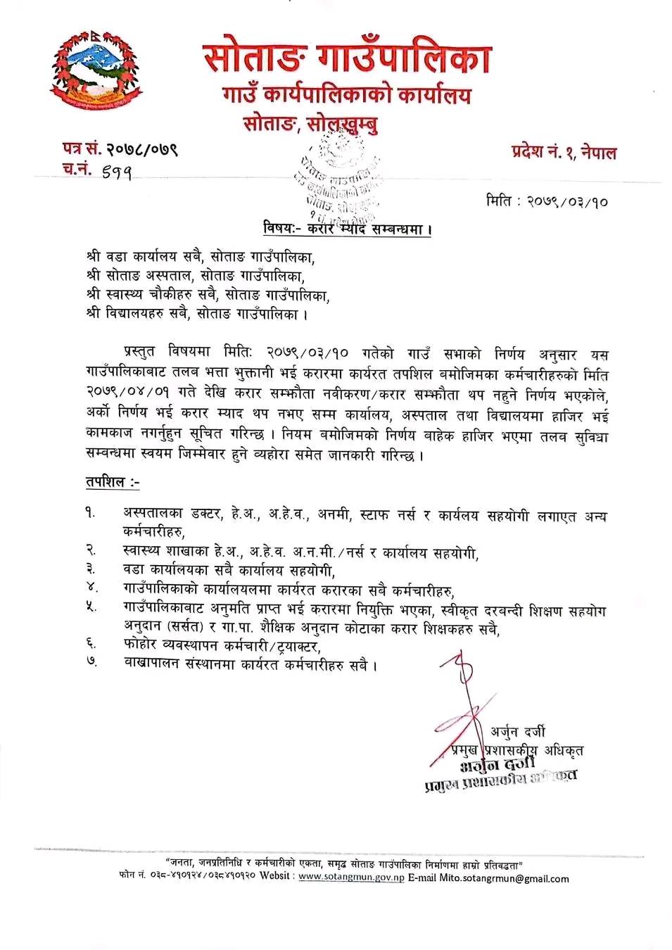 प्रमुख प्रशासकीय अधिकृत दर्जीद्धारा हस्ताक्षरित पत्रमा आगामी ०७९ साउन १ गतेदेखि करार सेवाका कर्मचारीहरुको करार सम्झौता थप तथा नवीकरण नहुने निर्णय भएका कारण अर्काे निर्णय भइ करार थप नभएसम्मका लागि कार्यालय,अस्पताल तथा विद्यालयमा हाजिर भइ काम काज नगर्न र हाजिर भएमा तलब सुबिधा सम्बन्धमा स्वंयम जिम्मेवार हुने जनाइएको छ ।