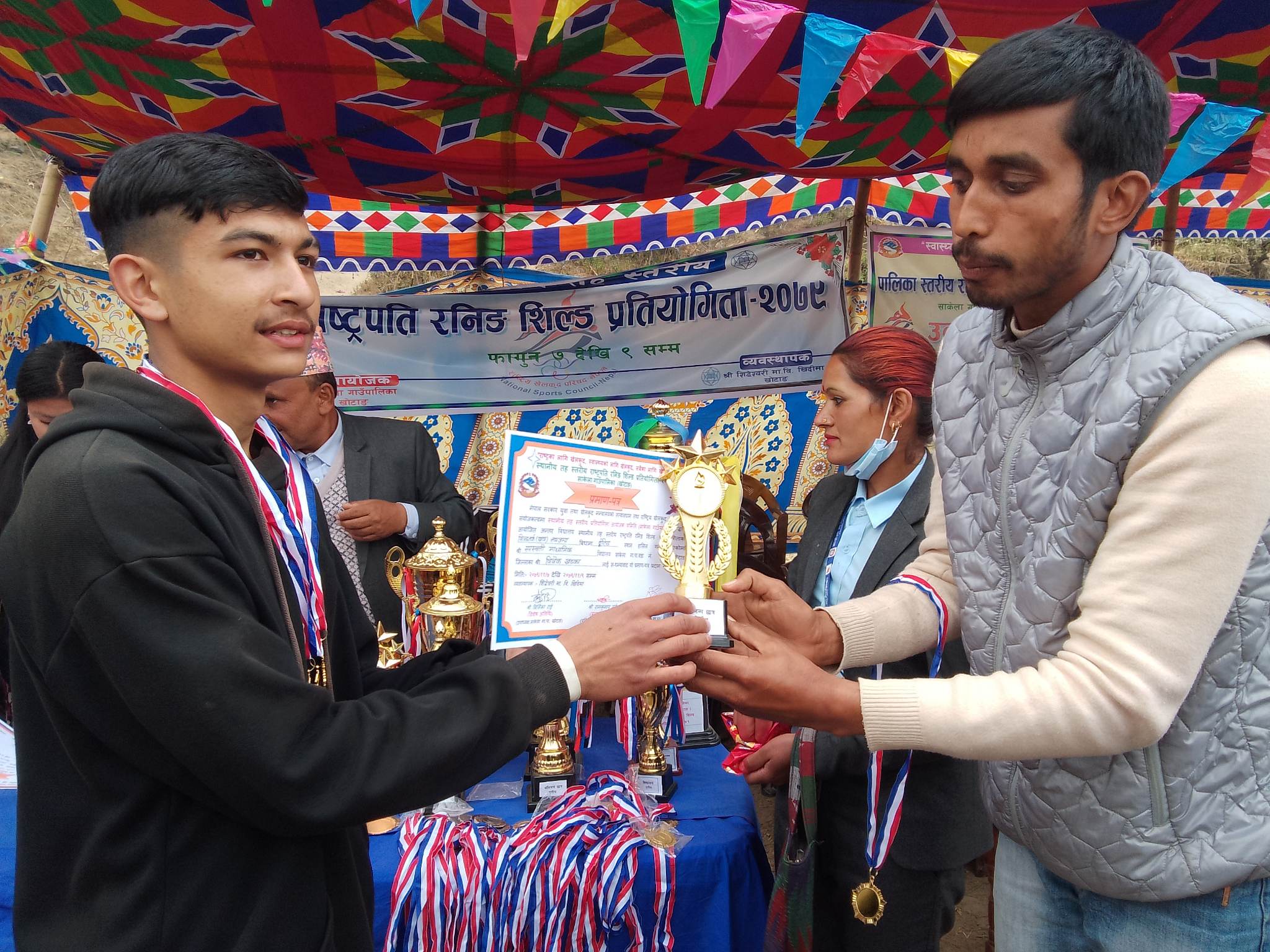 यस पटक आयोजना गरिएको पाँचौ राष्ट्रपति रनिङ शिल्ड प्रतियोगिताको उपाधी साकेला मावि रत्न्छाले प्राप्त गरेको छ । ११ स्वर्ण ५ रजत र २ कास्य सहित साकेला मावि यस वर्षको राष्ट्रपति रनिङ शिल्ड प्रतियोगिताको प्रथम विद्यालय भएको छ भने ६ स्वर्ण १० रजत र ४ कास्य सहित सरस्वती मावि मावि मात्तिम दोश्रो तथा १ स्वर्ण र ३ कास्य गरी सिद्देश्वरी मावि खिदिमा तेश्रो भएको छ । त्यस्तै २ रजत र ४ कास्य सहित बालबालिका मावि र १ रजत सहित ५ कास्य प्राप्त गरेको राधाकृषण मावि बाँझेच्यानडाँडा क्रमश चौथो र पाँचौ स्थानमा रहेका छन् ।