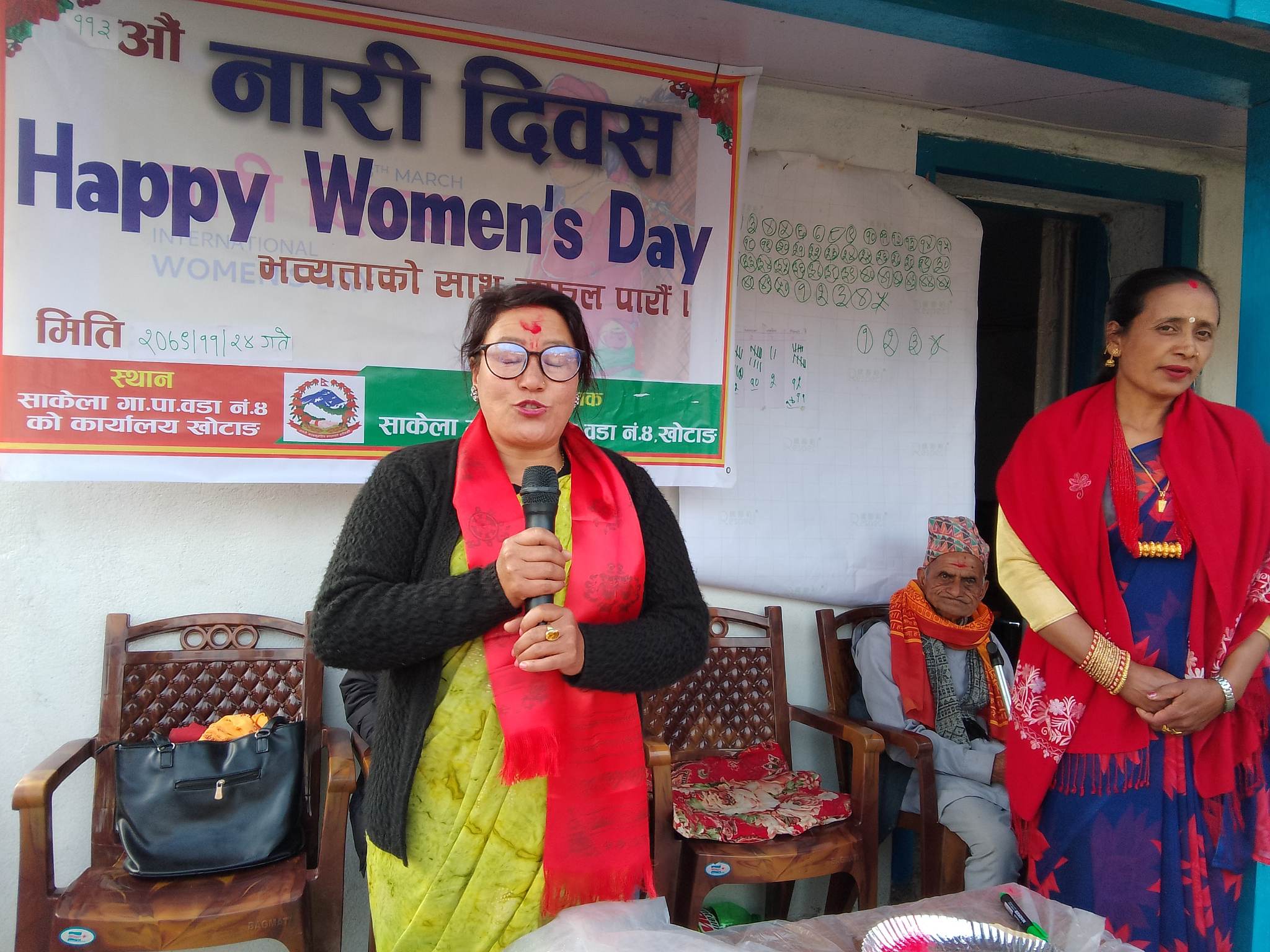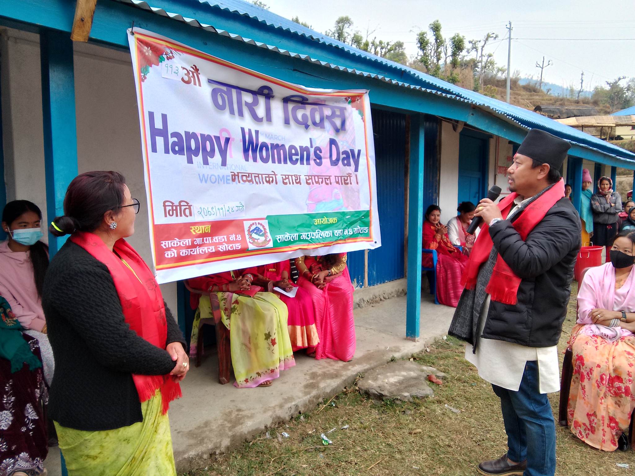 साकेला– महिलाहरुलाई नेतृत्व तहमा पुर्याई आर्थिक, सामाजिक, राजनैतिक क्षेत्रमा अघि बढ्नका लागि महिला लक्षित कार्यक्रम बनाएर सहयोग गरिने साकेला गाउँपालिकाका अध्यक्ष रवि प्रकाश राईले बताउनुभएको छ । ११३औं अन्तर्राष्ट्रिय नारी दिवसको अवसरमा गाउँपालिकाको वडाहरुमा भएको विभिन्न कार्यक्रमहरुलाई सम्बोधन गर्दै अध्यक्ष राईले संविधानबाट प्राप्त अधिकारहरुलाई पुरा गर्नका लागि नीति बनाएर पालिकाको तर्फबाट थप सहयोग गरिने बताउनुभएको हो ।