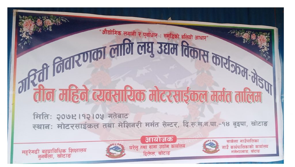 चार बर्षदेखि प्रत्येक बर्ष एउटा वडाका युवाहरुलाई लक्षित गरी बिभिन्न सीपमुलक तालिम प्रदान गर्दै आएको गाउँपालिकाले यस बर्ष दुई नम्बर वडालाई लक्षित गरेको जनाईएको छ । तालिम गत पाँच गतेदेखि दिक्तेल रुपाकोट मझुवागढी नगरपालिका–१४ बुइपास्थित मोटरसाईकल मर्मत तथा मेसिनरी मर्मत केन्द्रमा सञ्चालन भईरहको हो ।