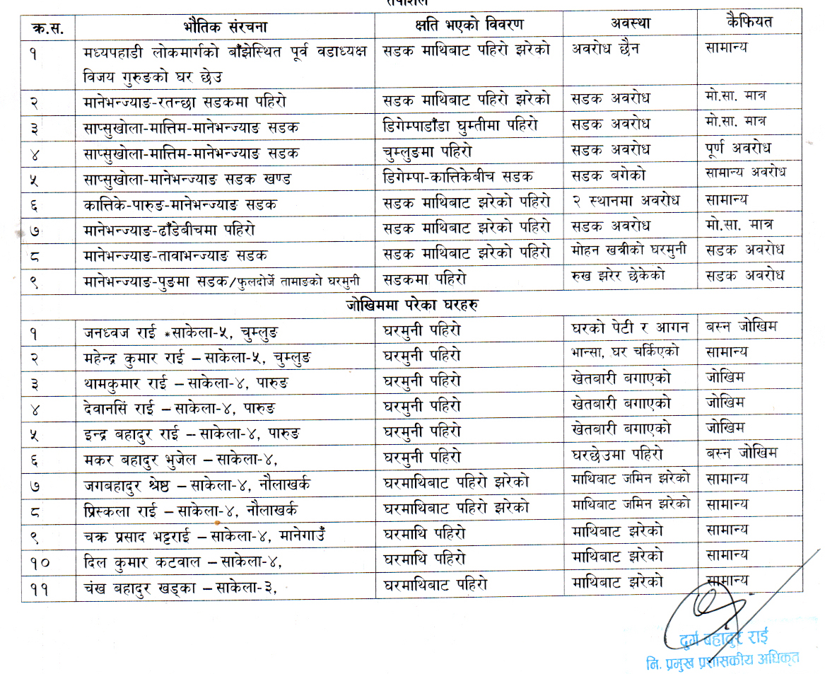 त्यस्तै मानेभन्ज्याङ-पुङमा सडक, मानेभन्ज्याङ-तावाभन्ज्याङ सडक, मानेभन्ज्याङ-रतन्छा सडक, कात्तिके-सोस्तुङ-नैनेपाटी सडक लगायत शाखा सडकहरुमा स-साना पहिरोका कारण सडक अवरुद्व बनेको पालिकाले जनाएको छ । अवरुद्ध बनेको सडक खुलाउने प्रयत्नमा गाउँपालिका लागि परेको छ भने पालिकाभित्र अन्यस्थानमा के कति क्षति भयो भनेर क्षतिको विवरण संकलन गर्ने कार्य भईरहेको गाउँपालिका अध्यक्ष रवि प्रकाश राईले जानकारी दिनुभयो । अवरुद्व बनेको सडकहरु तत्काल खुलाई आवतजावतमा सहजता ल्याउने प्रयास भईरहेको अध्यक्ष राईले बताउनुभयो ।