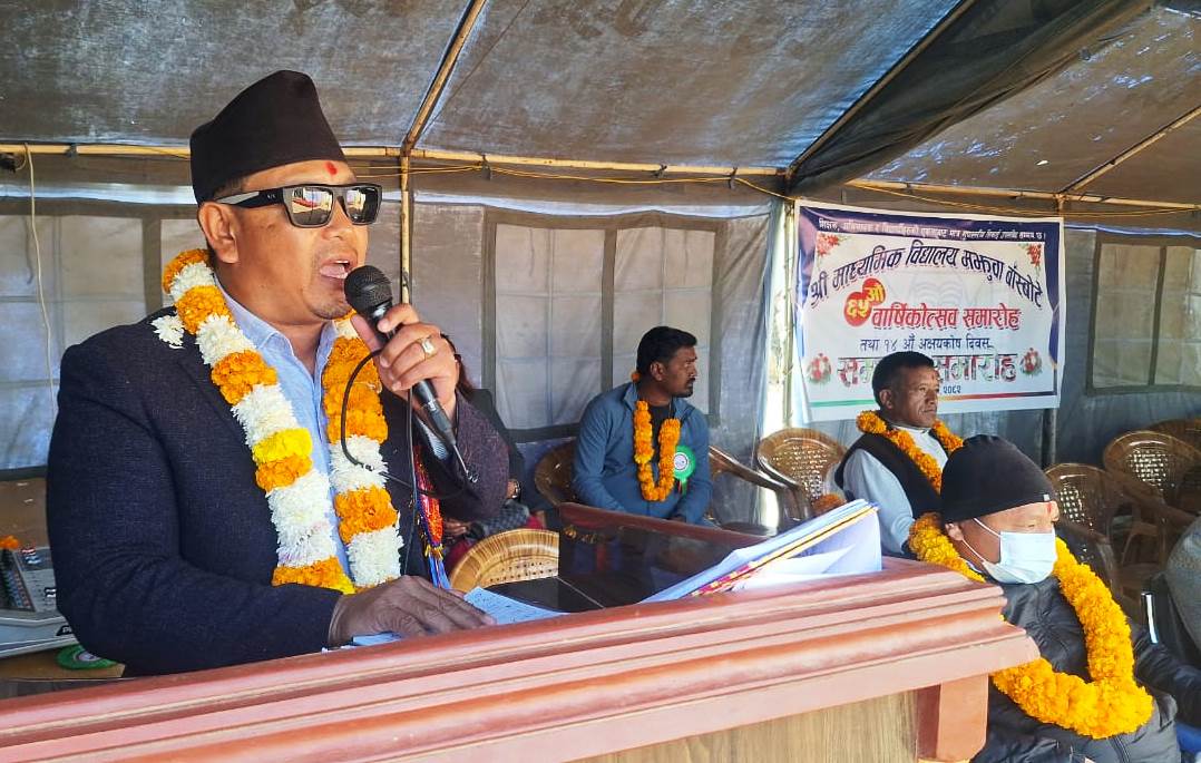 अध्यक्ष राईले हाल देशभर देखिएका शैक्षिक असमानता, स्रोत–साधनको अभाव र शिक्षामा घट्दो आकर्षणलाई मुख्य चुनौतीका रूपमा चित्रण गर्दै विद्यालयहरूलाई केवल प्रमाणपत्र वितरण गर्ने संस्थामा सीमित गर्न नहुने बताउनुभयो । समृद्ध देश निर्माणको पहिलो आधार नैतिक र व्यवहारिक शिक्षा अनिवार्य भएको उल्लेख गर्नुहुँदै उहाँले शिशुकक्षादेखिनै नैतिक शिक्षाको सुरुवात गर्नुपर्ने बताउनुभयो । योजना, दक्ष जनशक्ति र प्रविधिको समुचित प्रयोग भएमा स्थानीय तहबाटै शिक्षा क्षेत्रमा आमूल परिवर्तन सम्भव हुने उल्लेख गर्दै अध्यक्ष राईले गाउँपालिकाले आफूले गर्न सक्ने सबै प्रकारको सहयोग विद्यालयलाई उपलब्ध गराउने प्रतिबद्धता व्यक्त गर्नुभयो।